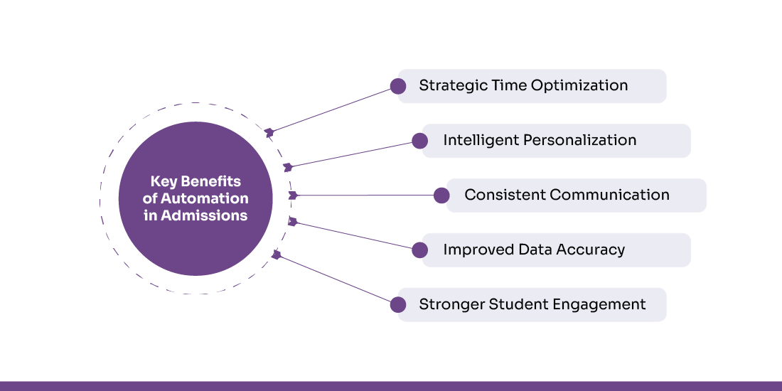 Automation in admissions delivers immediate time savings by handling repetitive administrative tasks such as tracking inquiries, sending follow-ups, and updating records. This allows admissions teams to focus on strategic planning, relationship-building, and personalized student counseling.