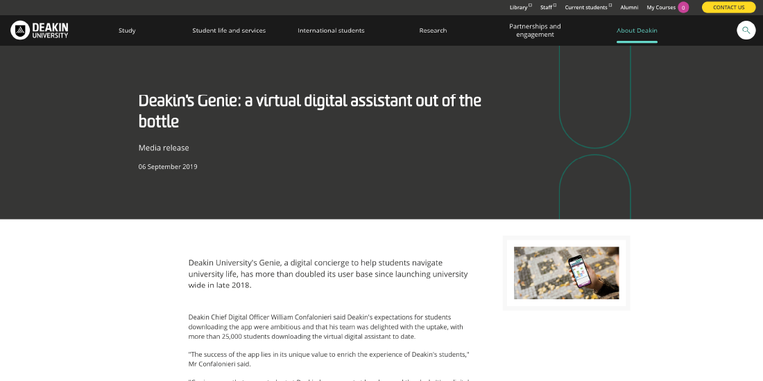Deakin University built Genie, a digital personal assistant powered partly by IBM Watson, voice recognition, and predictive analytics.