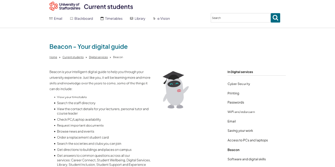 - Beacon acts as an “intelligent digital guide” to student life: it shows timetables, answers more than 400 FAQs on services and facilities, and connects students to their personal tutors.