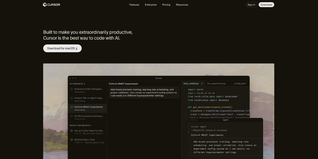 Cursor is an AI-first code editor that understands the full context of your project. Unlike plugins, AI is built directly into the editor.