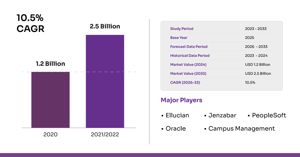 The demand for enrollment management software is rapidly increasing as institutions prioritize digital transformation in admissions. In 2024, the global EMS market was valued at approximately USD 1.2 billion and is projected to grow at a CAGR of 10–11%, reaching around USD 2.5–2.7 billion by 2032–2033. This growth reflects the increasing use of advanced enrollment tools to streamline processes and boost engagement at scale.