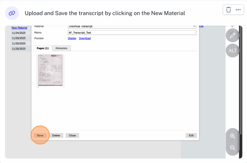 Go to the student’s record, click on the material tab and then click on the New Material link to upload and save the newly uploaded transcript of your choice.