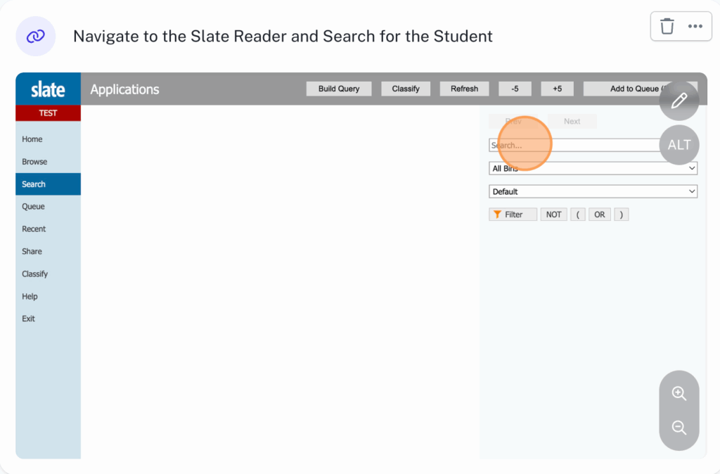 Navigate to the Slate Reader and click on the Search tab to search for the student of your choice and select the student from the list.