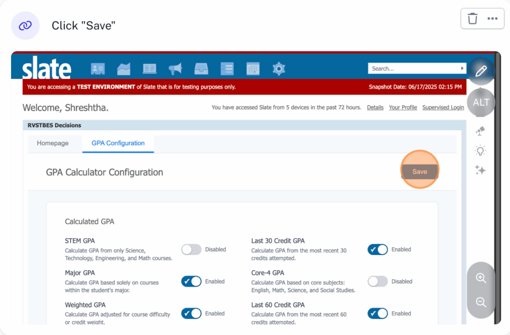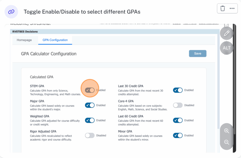 Upon making changes to the GPA Settings (For e.g. selecting the scale of your choice, GPAs etc.), click on the Save button to save the final changes.